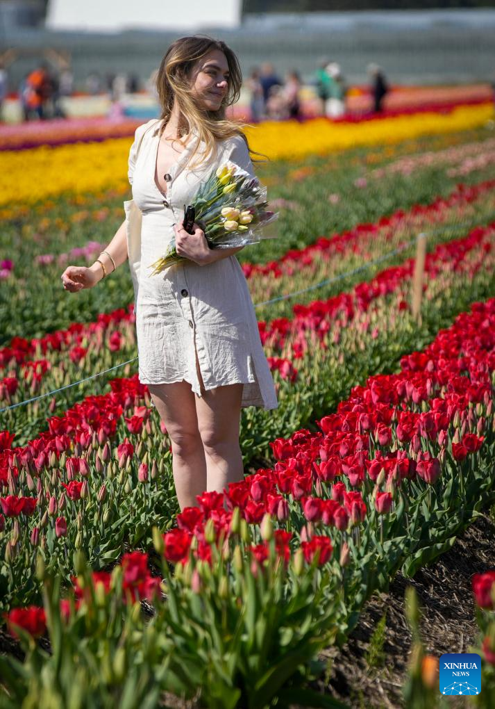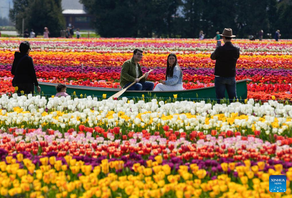 People walk between rows of tulips at the Abbotsford Tulip Festival in Abbotsford, British Columbia, Canada, on April 14, 2024. (Photo by Liang Sen/Xinhua)