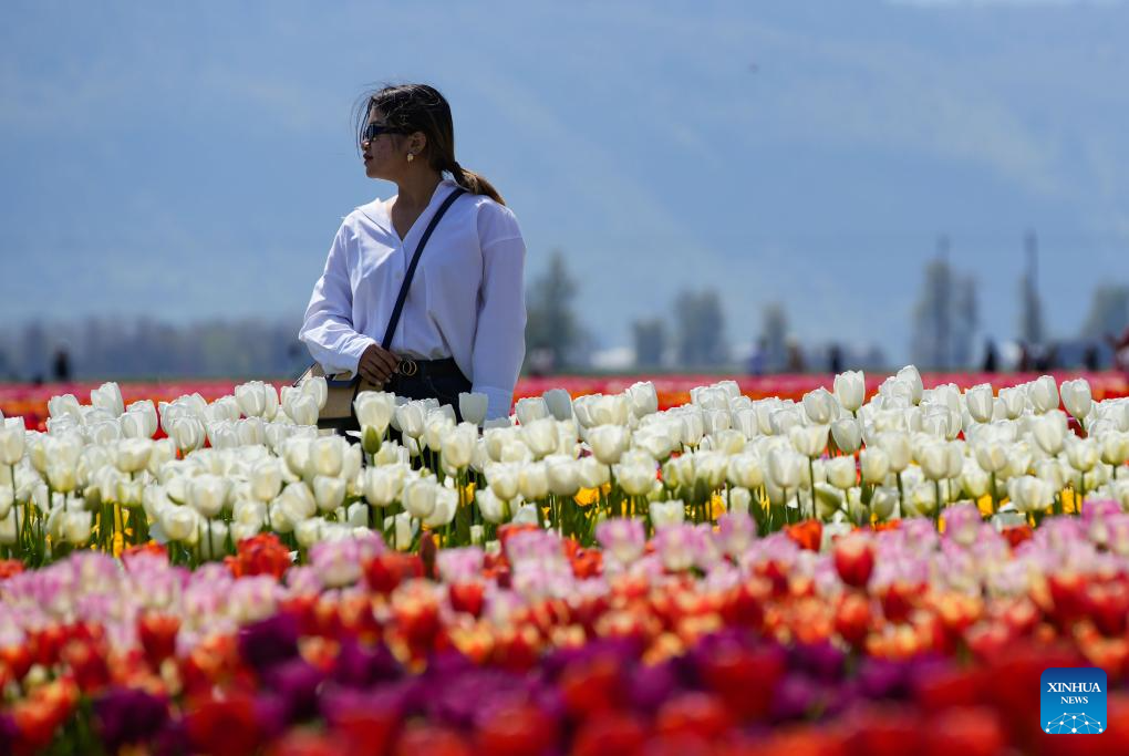 A woman stands between rows of tulips at the Abbotsford Tulip Festival in Abbotsford, British Columbia, Canada, on April 14, 2024. (Photo by Liang Sen/Xinhua)