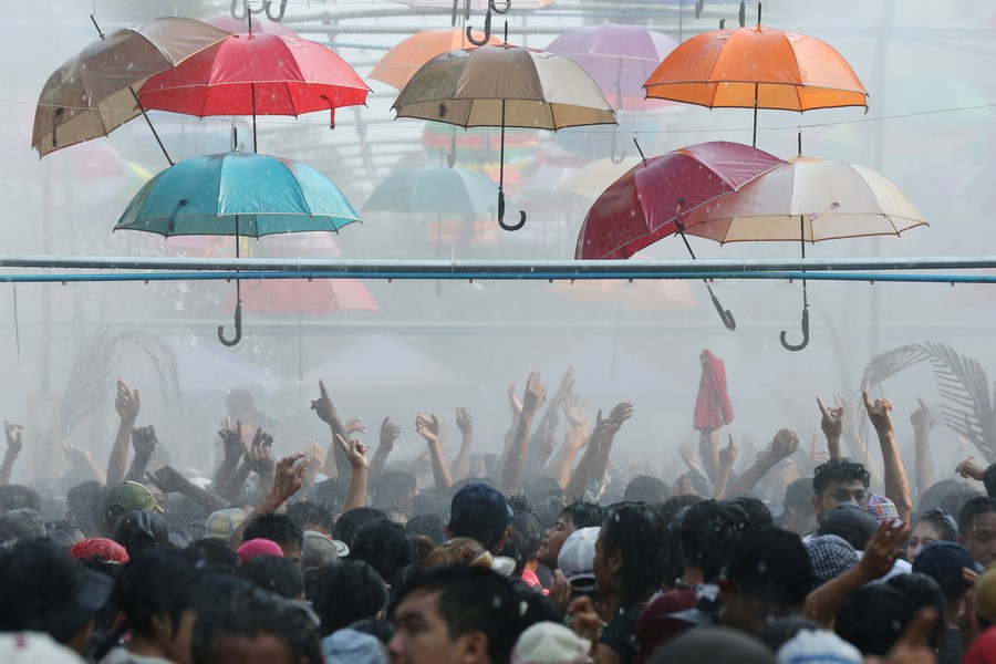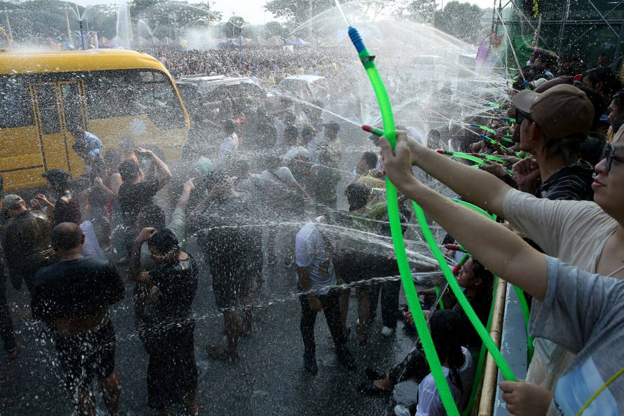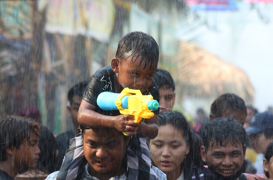 YANGON, April 16 (Xinhua) -- Water brings some chill to scorching summer heat during the Thingyan water festival in Yangon, Myanmar, with people throwing water at each other to drive out bad luck and embrace health and happiness.