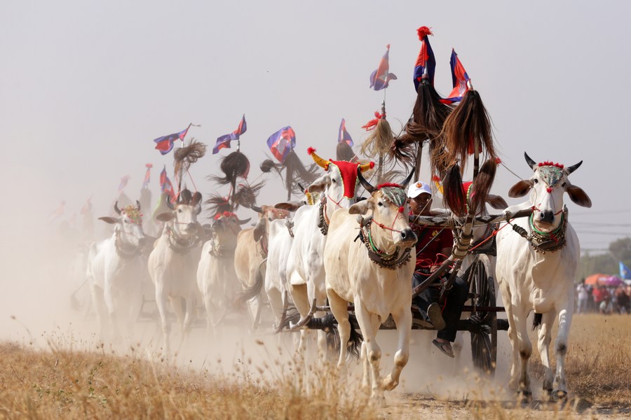 Contestants race their ox carts in Kampong Speu province, Cambodia, on April 7, 2024. (Photo by Phearum/Xinhua)