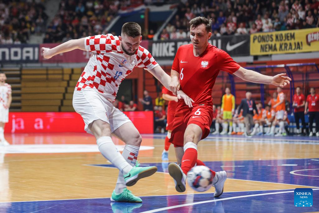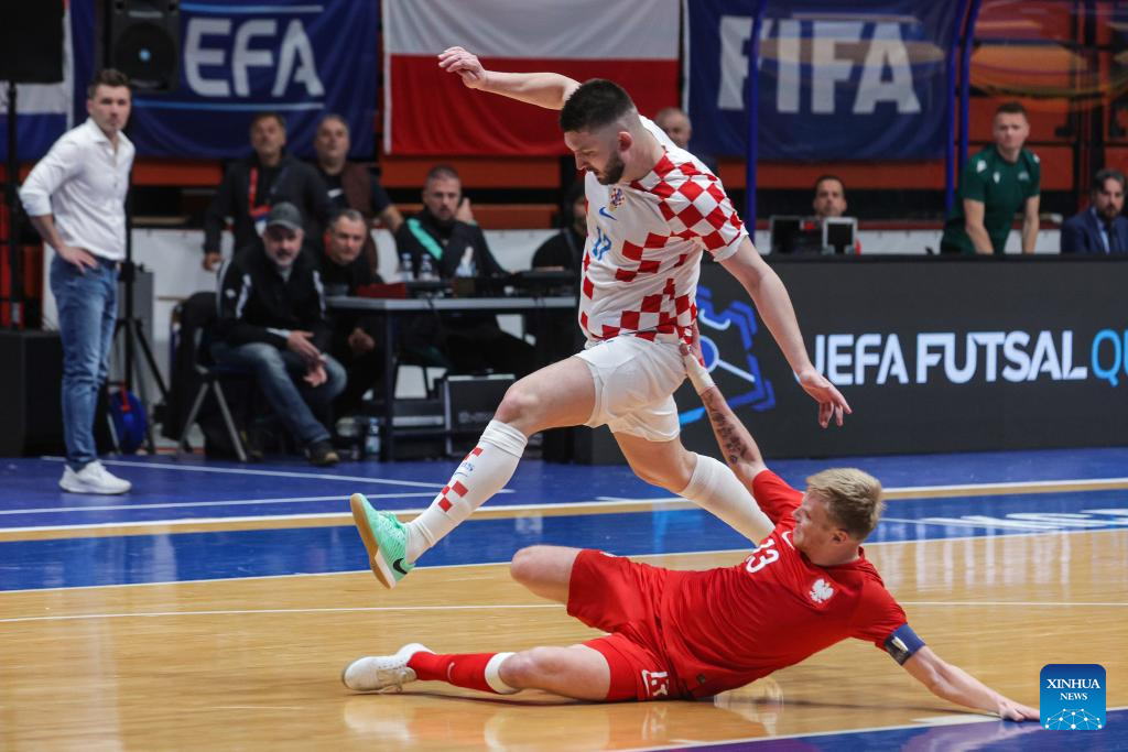 David Mataja (R) of Croatia vies against Mateusz Madziag of Poland during the Futsal World Cup elite Round play-off 2nd leg match between Croatia and Poland in Zagreb, Croatia, on April 16, 2024. (Photo by Luka Stanzl/PIXSELL via Xinhua)