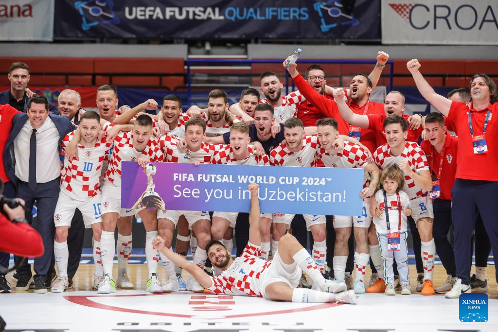 Members of team Croatia celebrate after the Futsal World Cup elite Round play-off 2nd leg match between Croatia and Poland in Zagreb, Croatia, on April 16, 2024. (Photo by Luka Stanzl/PIXSELL via Xinhua)