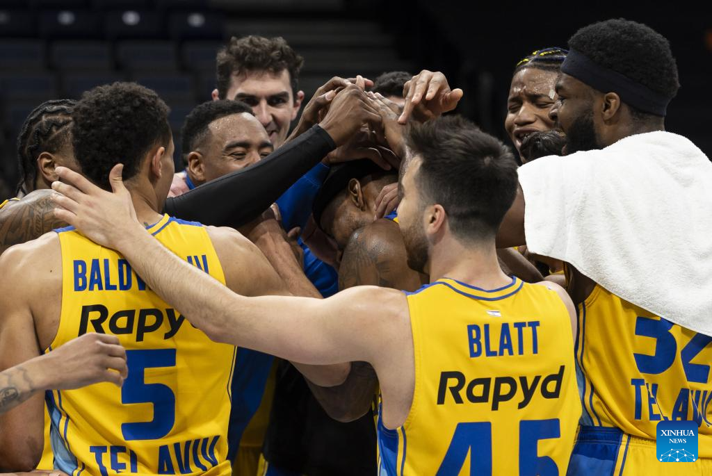 Maccabi's players celebrate victory after round one play-in Euroleague basketball match between Maccabi and Basconia in Belgrade, Serbia, on April 16, 2024. (Photo by Predrag Milosavljevic/Xinhua)