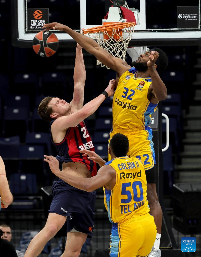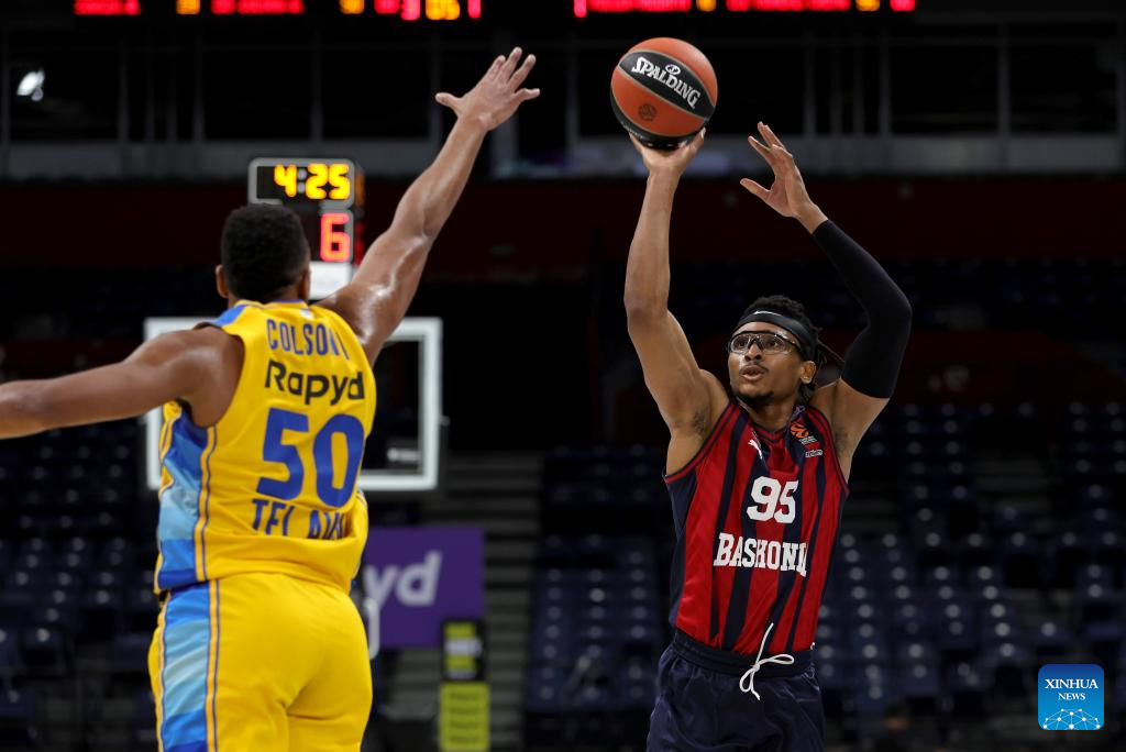 Basconia's Chima Moneke (R) shoots against Maccabi's Bonzie Colson during round one play-in Euroleague basketball match between Maccabi and Basconia in Belgrade, Serbia, on April 16, 2024. (Photo by Predrag Milosavljevic/Xinhua)
