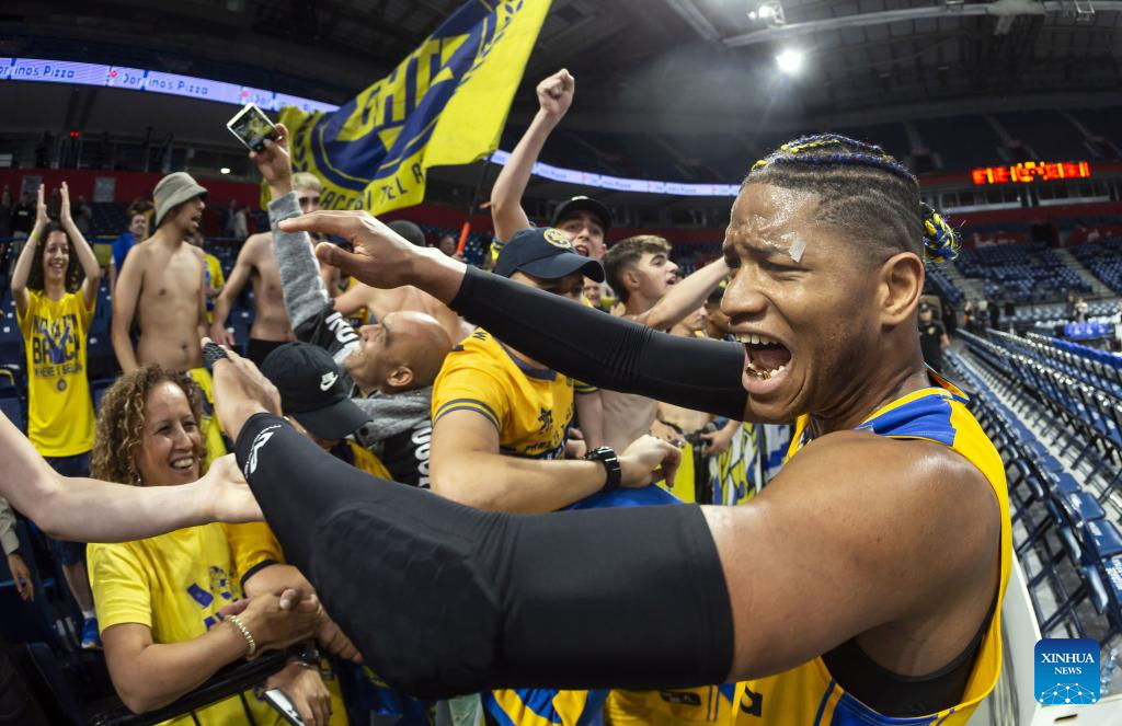 Maccabi's Antonius Cleveland celebrate victory after round one play-in Euroleague basketball match between Maccabi and Basconia in Belgrade, Serbia, on April 16, 2024. (Photo by Predrag Milosavljevic/Xinhua)
