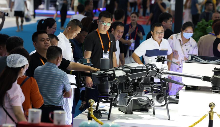 Visitors look at drones of DJI at the fourth China International Consumer Products Expo in Haikou, capital city of south China's Hainan Province, April 17, 2024. (Xinhua/Yang Guanyu)