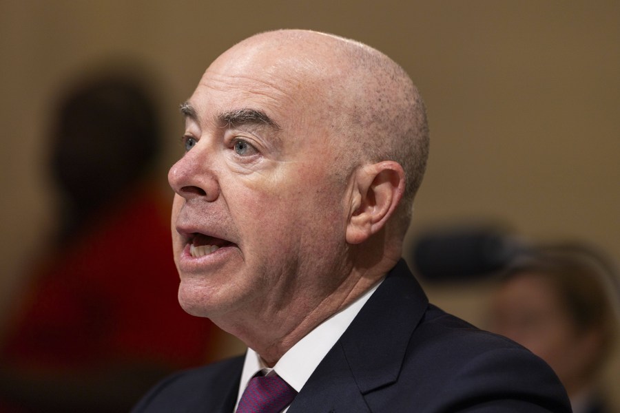 This file photo taken on Nov. 15, 2023, shows U.S. Homeland Security Secretary Alejandro Mayorkas testifying before the House Committee on Homeland Security during a hearing in Washington, D.C., the United States. (Photo by Aaron Schwartz/Xinhua)