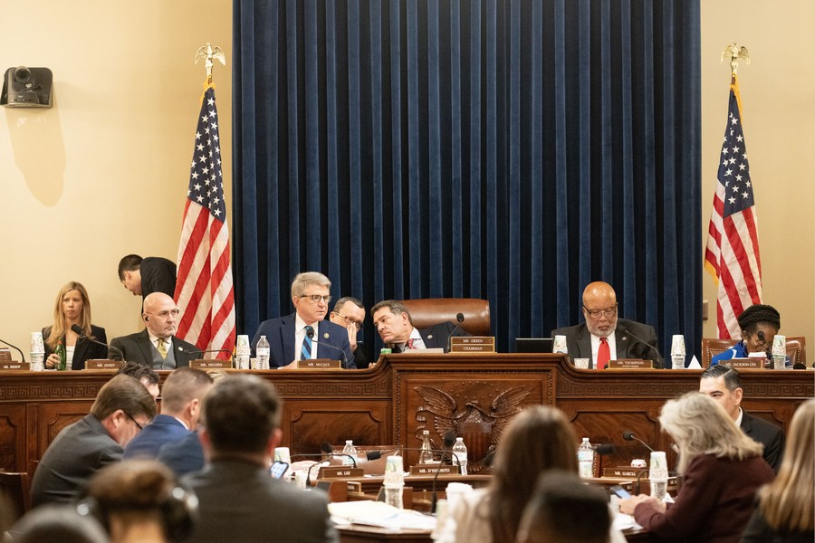 Photo taken on Jan. 30, 2024, shows a U.S. House Homeland Security Committee meeting to impeach Homeland Security Secretary Alejandro Mayorkas over the crisis at the U.S.-Mexico border, in Washington, D.C., the United States.(Xinhua/Liu Jie)