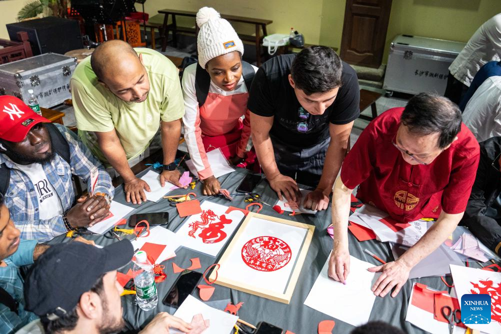 International students learn to make paper-cutting items at the Museum of Intangible Cultural Heritage of Changsha in central China's Hunan Province, April 18, 2024. As the United Nations Chinese Language Day is around the corner, which is observed on April 20 every year since 2010, the School of International Education of Central South University joined hands with the Museum of Intangible Cultural Heritage of Changsha to invite more than 100 international students from over 20 countries and regions to experience traditional Chinese intangible cultural heritages like paper cutting and dough modelling making. (Xinhua/Chen Sihan)