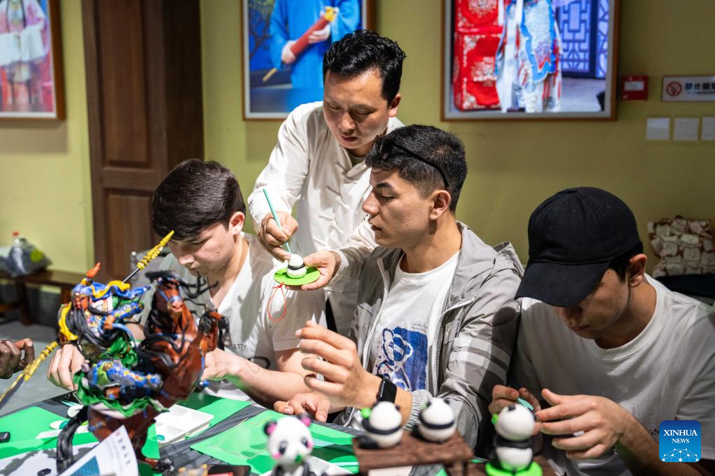 International students learn dough modelling at the Museum of Intangible Cultural Heritage of Changsha in central China's Hunan Province, April 18, 2024. As the United Nations Chinese Language Day is around the corner, which is observed on April 20 every year since 2010, the School of International Education of Central South University joined hands with the Museum of Intangible Cultural Heritage of Changsha to invite more than 100 international students from over 20 countries and regions to experience traditional Chinese intangible cultural heritages like paper cutting and dough modelling making. (Xinhua/Chen Sihan)