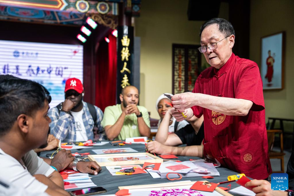 An intangible cultural heritage inheritor (1st R) teaches international students paper-cutting techniques at the Museum of Intangible Cultural Heritage of Changsha in central China's Hunan Province, April 18, 2024. As the United Nations Chinese Language Day is around the corner, which is observed on April 20 every year since 2010, the School of International Education of Central South University joined hands with the Museum of Intangible Cultural Heritage of Changsha to invite more than 100 international students from over 20 countries and regions to experience traditional Chinese intangible cultural heritages like paper cutting and dough modelling making. (Xinhua/Chen Sihan)
