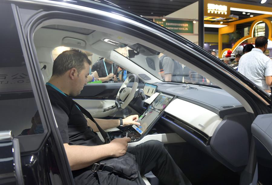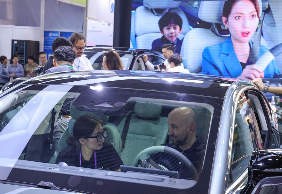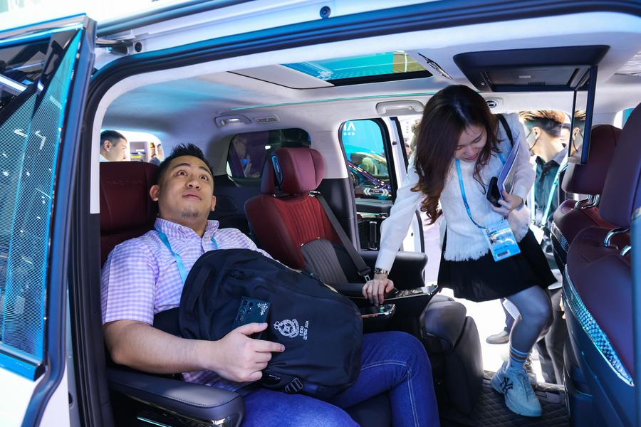 A visitor tries a new energy vehicle during the 135th session of the China Import and Export Fair, also known as the Canton Fair, in Guangzhou, south China's Guangdong Province, April 15, 2024. (Xinhua/Lu Hanxin)