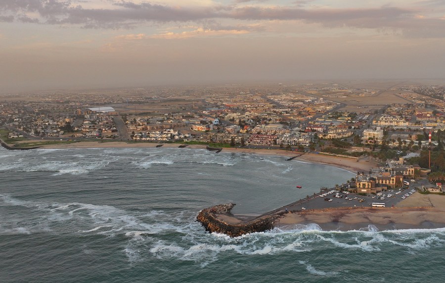 An aerial drone photo taken on March 25, 2024 shows a view in Swakopmund, Namibia. (Xinhua/Chen Cheng)