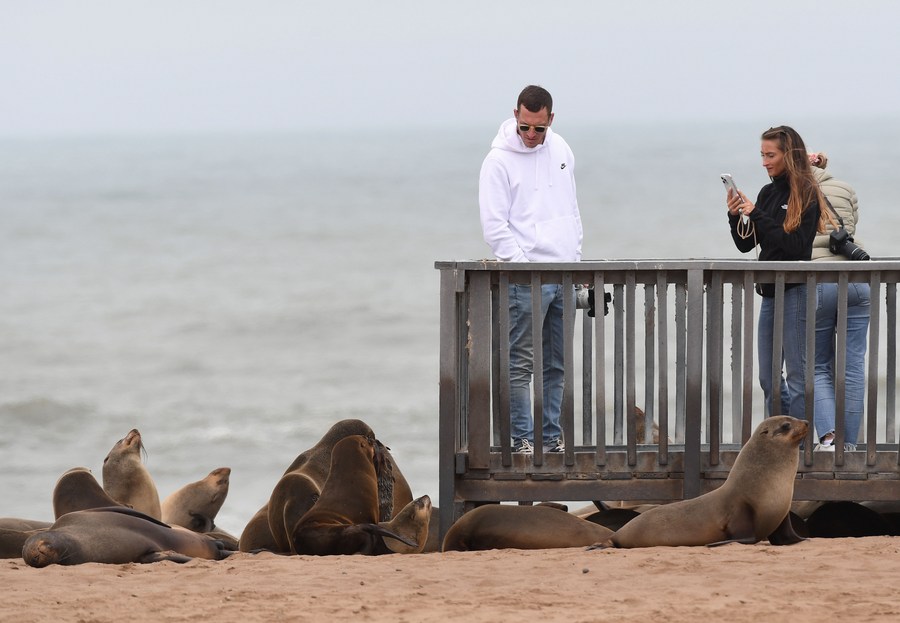 Tourists view Cape fur seals in the Cape Cross Seal Reserve, Namibia, Oct. 11, 2023. (Xinhua/Chen Cheng)
