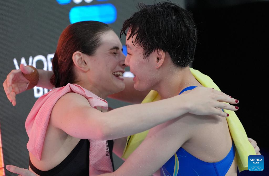 Chen Yiwen (R) of China celebrates with Maddison Keeney of Australia after the women's 3m springboard final at the World Acquatics Diving World Cup 2024 Super Final in Xi'an, northwest China's Shaanxi Province, April 20, 2024. (Xinhua/Li Yibo)