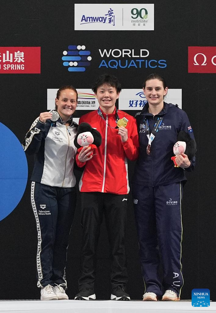 Gold medalist Chen Yiwen (C) of China, silver medalist Chiara Pellacani (L) of Italy and bronze medalist Maddison Keeney of Australia pose during the awarding ceremony for the women's 3m springboard event at the World Acquatics Diving World Cup 2024 Super Final in Xi'an, northwest China's Shaanxi Province, April 20, 2024. (Xinhua/Li Yibo)