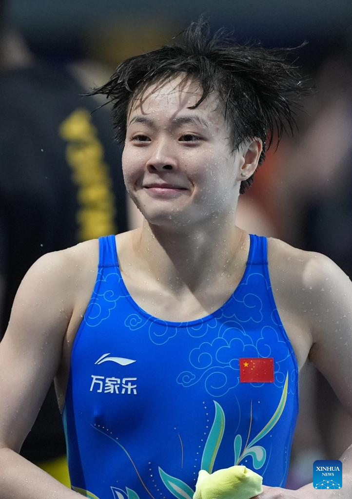 Chen Yiwen of China reacts after claiming the title of the women's 3m springboard final at the World Acquatics Diving World Cup 2024 Super Final in Xi'an, northwest China's Shaanxi Province, April 20, 2024. (Xinhua/Li Yibo)