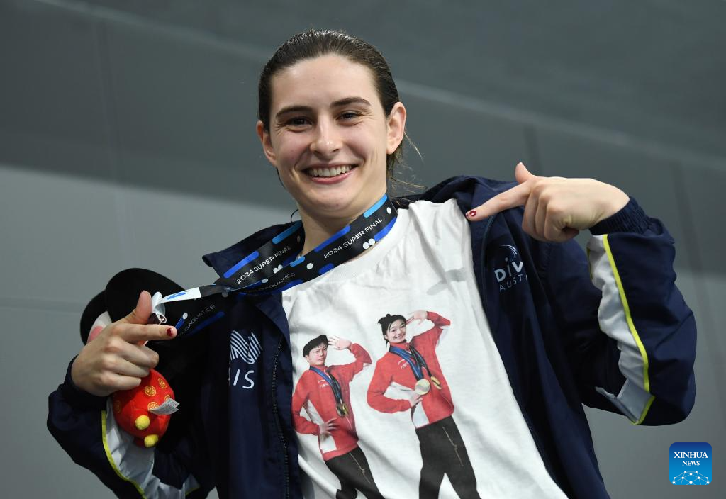 Maddison Keeney of Australia shows her T-shirt with the picture of Chinese divers Chen Yiwen and Chang Yani after the awarding ceremony for the women's 3m springboard event at the World Acquatics Diving World Cup 2024 Super Final in Xi'an, northwest China's Shaanxi Province, April 20, 2024. (Xinhua/Li Yibo)