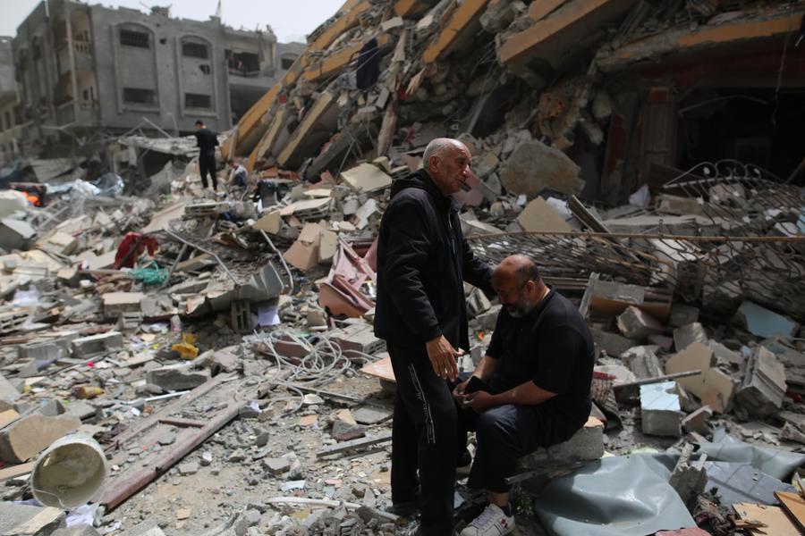 A man comforts another man near the rubble of a destroyed building in Nuseirat refugee camp, central Gaza Strip, on April 18, 2024. (Xinhua)