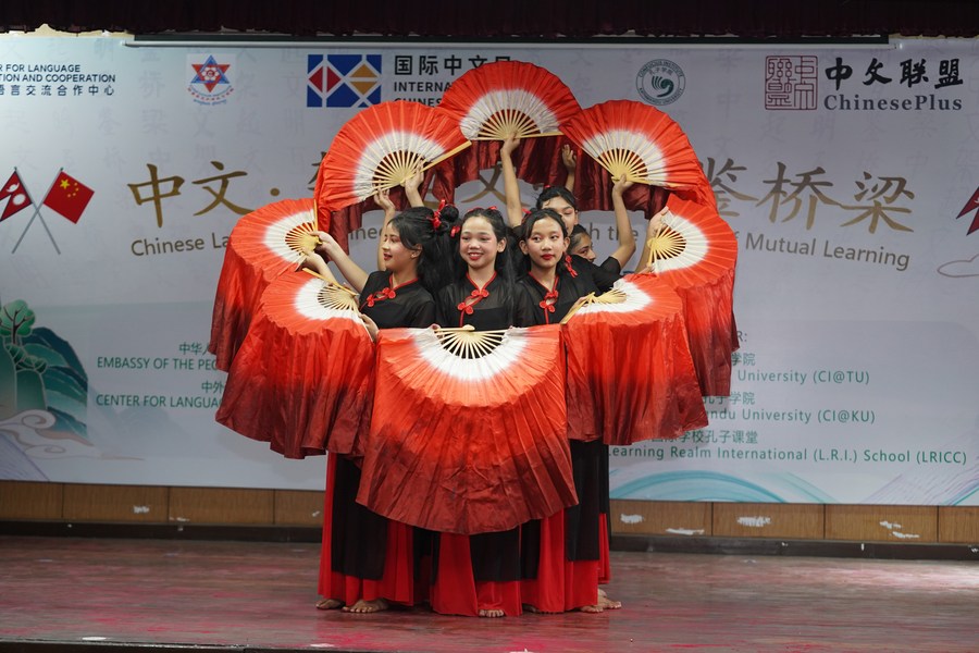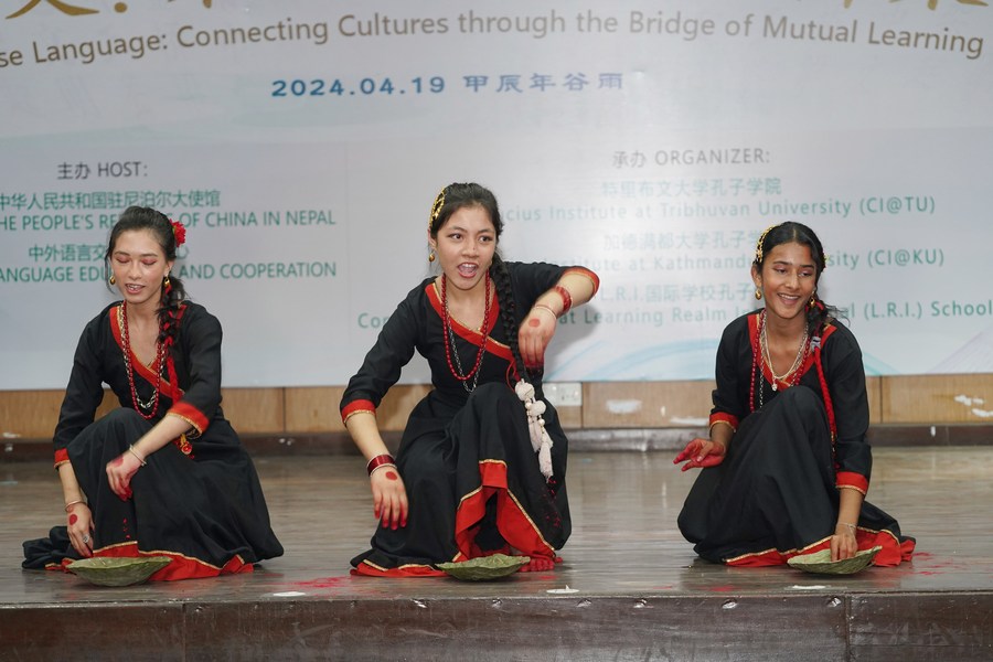 This photo shows learners performing a dance at an event held to mark the 15th United Nations Chinese Language Day in Kathmandu, Nepal, April 19, 2024. (Photo by Hari Maharjan/Xinhua)