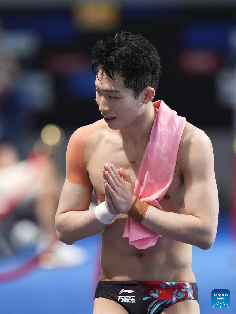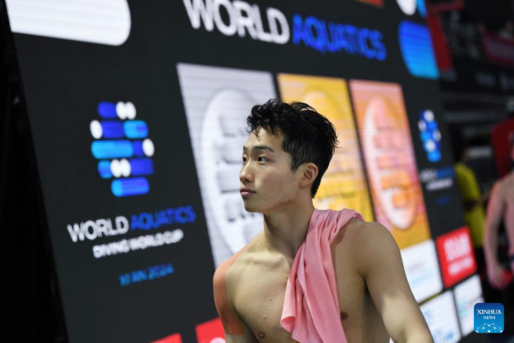 Wang Zongyuan of China reacts during the men's 3m springboard final at the World Acquatics Diving World Cup 2024 Super Final in Xi'an, northwest China's Shaanxi Province, April 20, 2024. (Xinhua/Li Yibo)