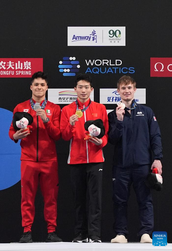 Gold medalist Wang Zongyuan (C) of China, silver medalist Osmar Olvera Ibarra (L) of Mexico and bronze medalist Jack Laugher of Britain pose during the awarding ceremony for the men's 3m springboard event at the World Acquatics Diving World Cup 2024 Super Final in Xi'an, northwest China's Shaanxi Province, April 20, 2024. (Xinhua/Li Yibo)