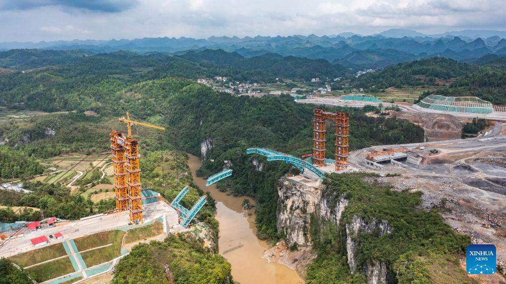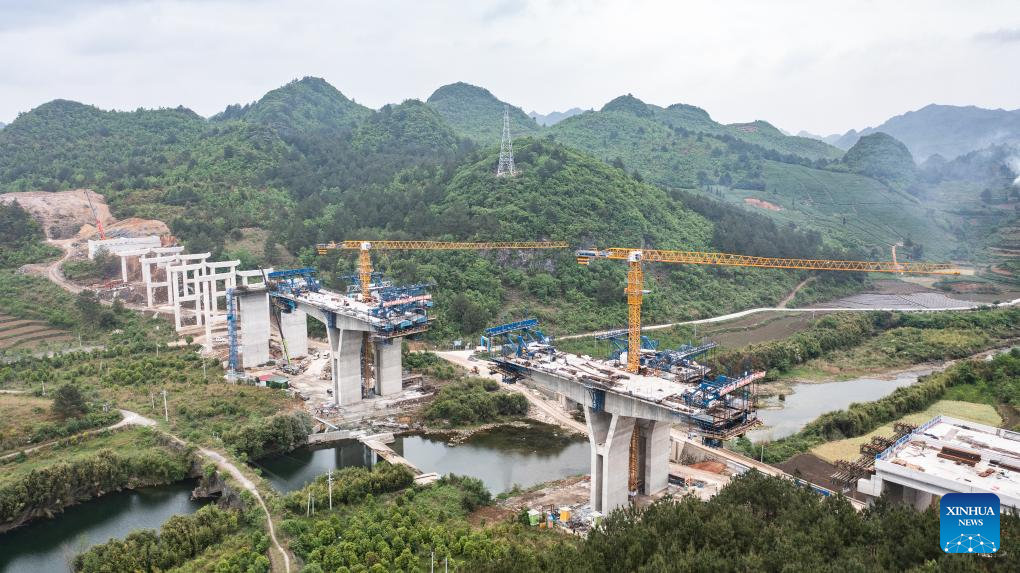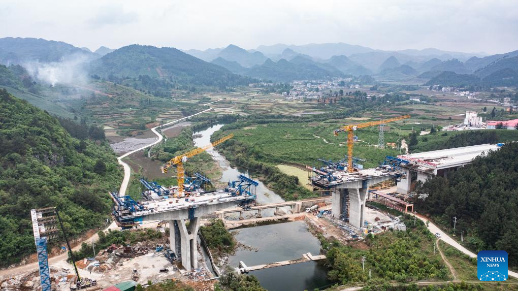 An aerial drone photo taken on April 18, 2024 shows the Lami River bridge along the Guiyang-Pingtang expressway under construction in southwest China's Guizhou Province. With a designed speed of 100 km per hour, the Guiyang-Pingtang expressway in Guizhou has a total length of 174.018 km. (Xinhua/Tao Liang)