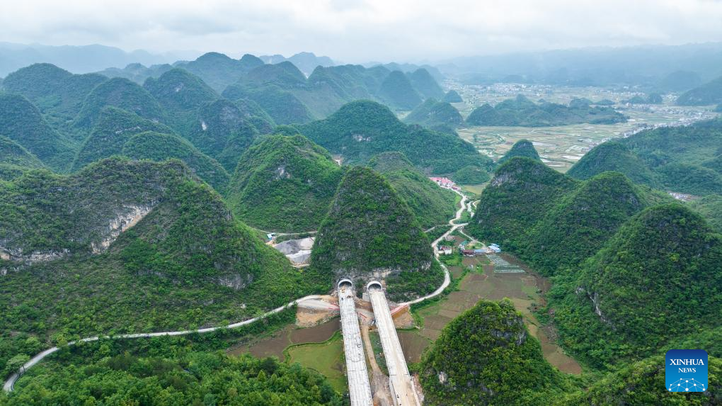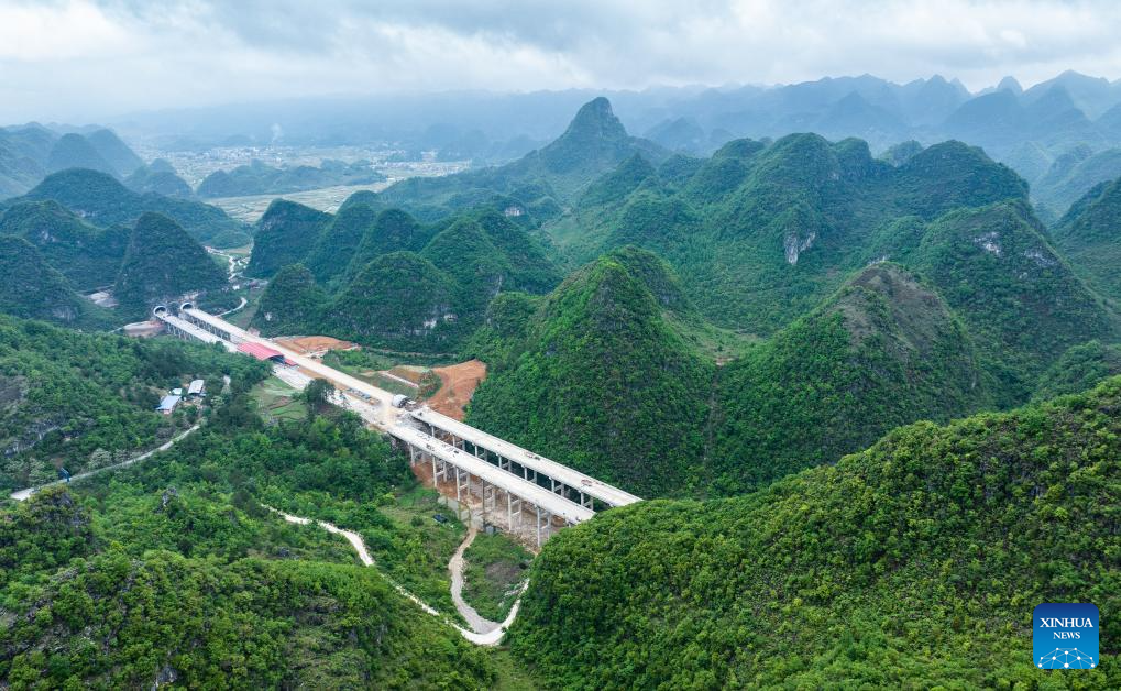 An aerial drone photo taken on April 18, 2024 shows the Sizhai-Yunyangguan section of the Guiyang-Pingtang expressway under construction in southwest China's Guizhou Province. With a designed speed of 100 km per hour, the Guiyang-Pingtang expressway in Guizhou has a total length of 174.018 km. (Xinhua/Tao Liang)