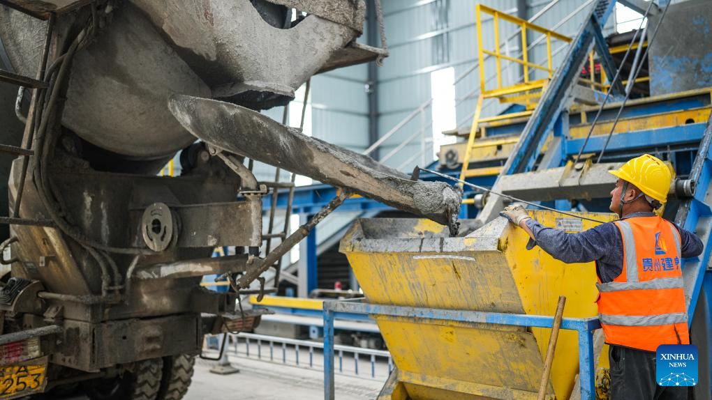 A worker operates at a production site for highway guardrail along the Guiyang-Pingtang expressway in southwest China's Guizhou Province, April 18, 2024. With a designed speed of 100 km per hour, the Guiyang-Pingtang expressway in Guizhou has a total length of 174.018 km. (Xinhua/Tao Liang)