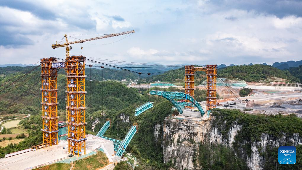 An aerial drone photo taken on April 17, 2024 shows the Bailong River bridge along the Guiyang-Pingtang expressway under construction in southwest China's Guizhou Province. With a designed speed of 100 km per hour, the Guiyang-Pingtang expressway in Guizhou has a total length of 174.018 km. (Xinhua/Tao Liang)