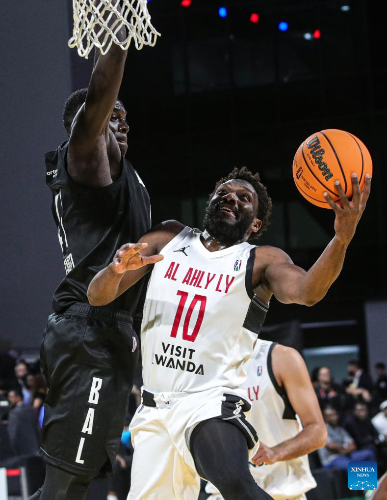Souleyman Diabate (R) of Al Ahly Ly goes for a layup at the 2024 Basketball Africa League match between Al Ahly Ly of Libya and Bangui of Central African Republic in Cairo, Egypt, April 19, 2024. (Xinhua/Ahmed Gomaa)