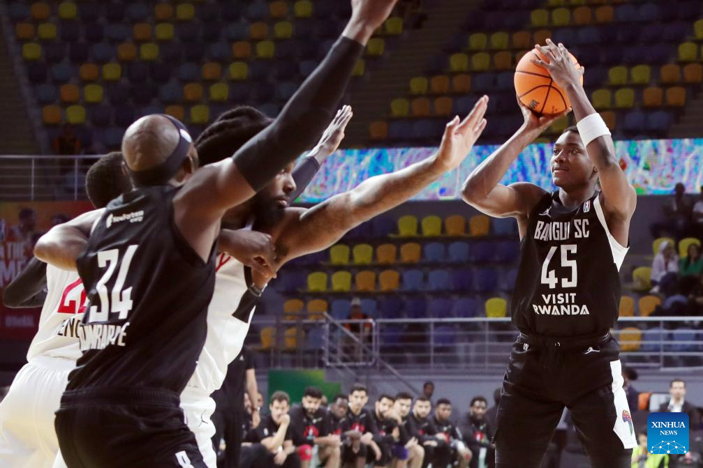 Thierry Serge Darlan (R) of Bangui competes at the 2024 Basketball Africa League match between Al Ahly Ly of Libya and Bangui of Central African Republic in Cairo, Egypt, April 19, 2024. (Xinhua/Ahmed Gomaa)