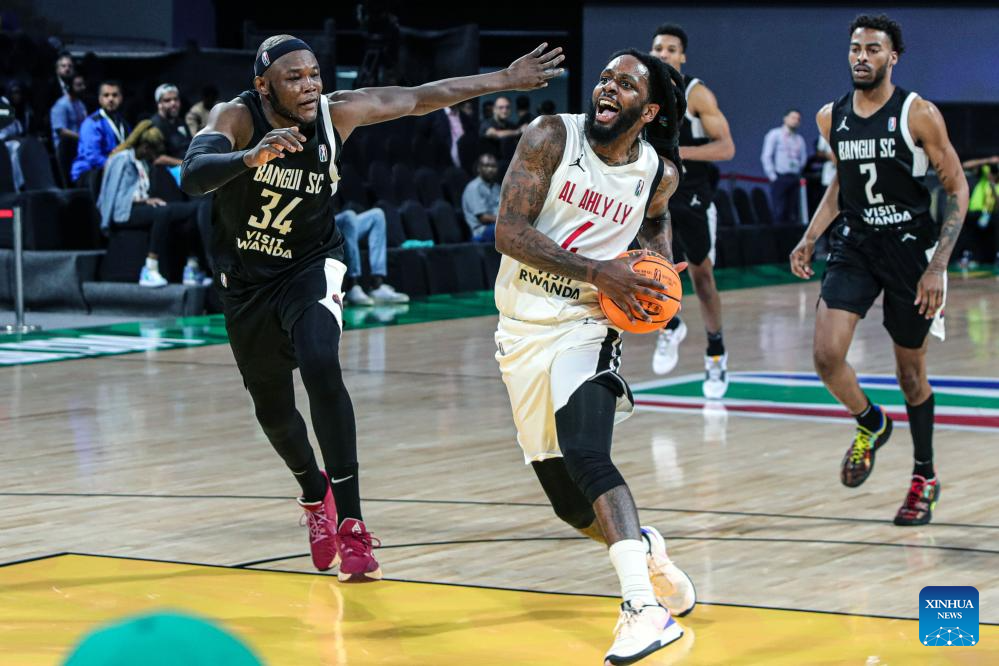 Kevin Marquis (R, front) of Al Ahly Ly breaks through at the 2024 Basketball Africa League match between Al Ahly Ly of Libya and Bangui of Central African Republic in Cairo, Egypt, April 19, 2024. (Xinhua/Ahmed Gomaa)