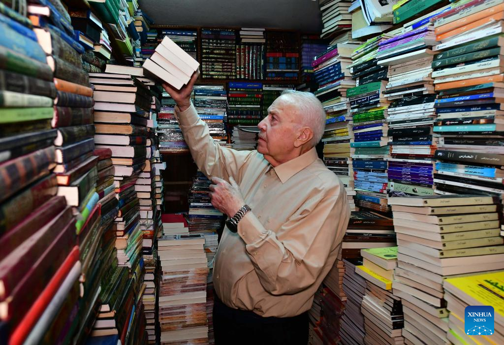 Bashir Jarkas arranges books at his vintage bookstore, Modern Library, in the ancient al-Halbouni area of Syria's capital Damascus, April 20, 2024.(Photo by Ammar Safarjalani/Xinhua)