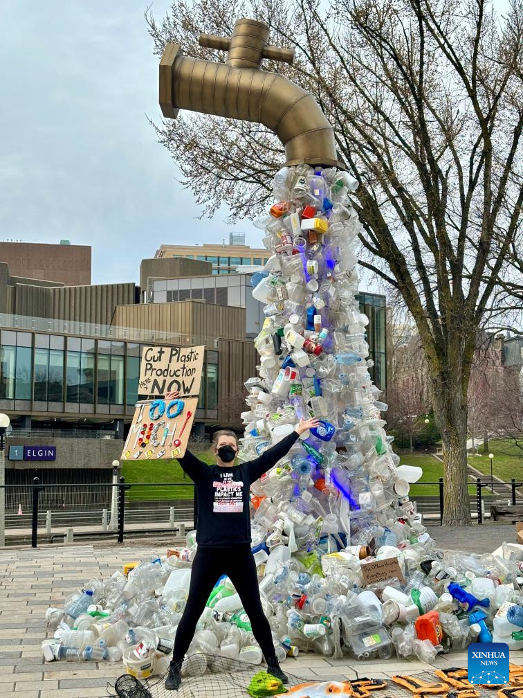 This photo taken on April 23, 2024 shows an art installation set up in front of the conference venue of the fourth session of the Intergovernmental Negotiating Committee (INC-4) in Ottawa, Canada. A new round of negotiations for a legally binding international treaty to eliminate plastic pollution must make meaningful progress, the head of the United Nations Environment Program (UNEP) said Tuesday.