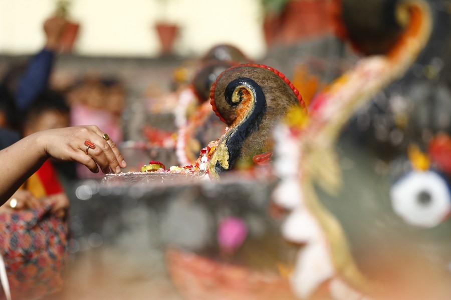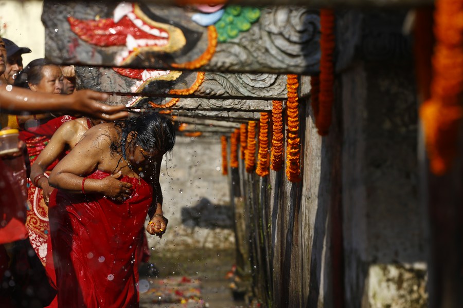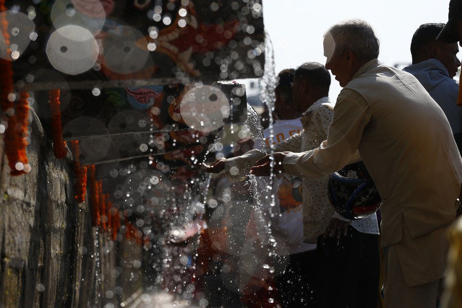 People perform a ritual during the Baishak Asnan festival in Kathmandu, Nepal, April 23, 2024. (Photo by Sulav Shrestha/Xinhua)