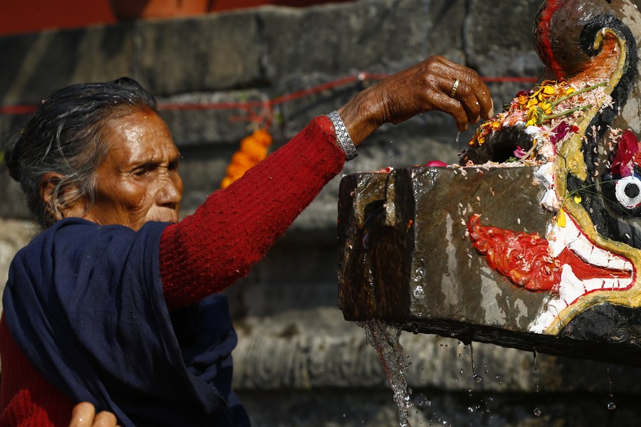 A woman pays reverence to a water spout during the Baishak Asnan festival in Kathmandu, Nepal, April 23, 2024. (Photo by Sulav Shrestha/Xinhua)■