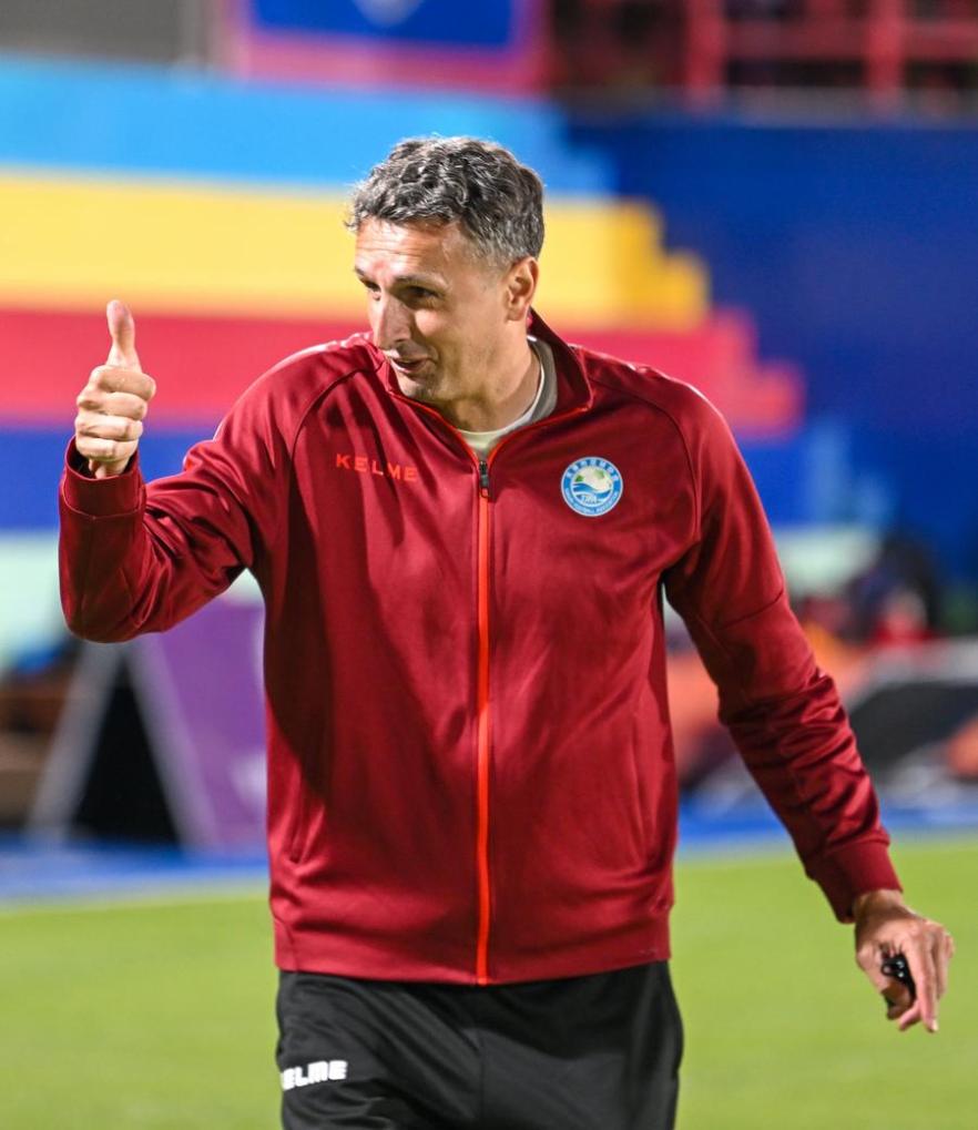 Serbian coach Aleksandar Pantic gives a thumb-up for young football players during a training session at Tianjin Football Association Youth Training Center in north China's Tianjin Municipality, April 23, 2024.