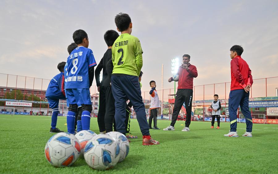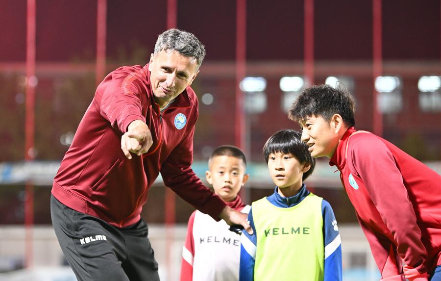 Serbian coach Aleksandar Pantic (L) gives instructions to young football players during a training session at Tianjin Football Association Youth Training Center in north China's Tianjin Municipality, April 23, 2024.