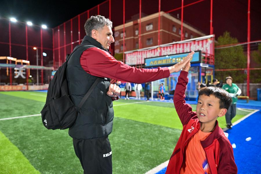 Serbian coach Aleksandar Pantic (L) high-fives with a young football player after a training session at Tianjin Football Association Youth Training Center in north China's Tianjin Municipality, April 23, 2024.