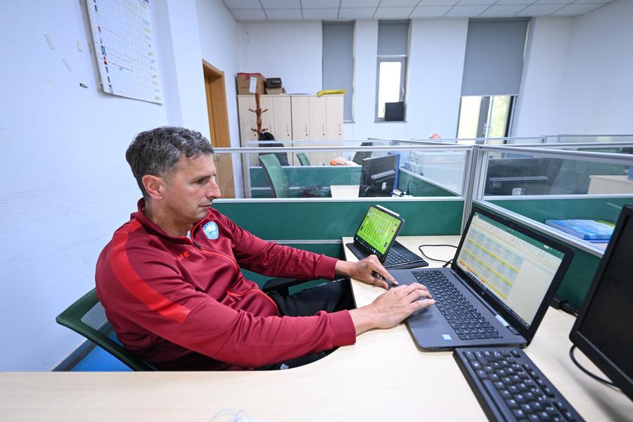 Serbian coach Aleksandar Pantic prepares training programs for young football players at Tianjin Football Association in north China's Tianjin Municipality, April 23, 2024.