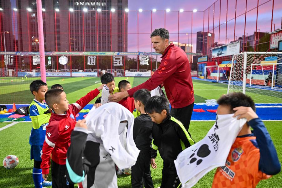 Serbian coach Aleksandar Pantic (Top) distributes group jerseys to young football players during a training session at Tianjin Football Association Youth Training Center in north China's Tianjin Municipality, April 23, 2024.
