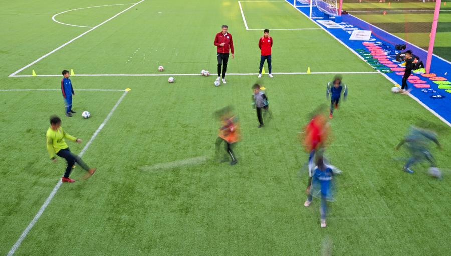 Serbian coach Aleksandar Pantic (Top, L) watches the training of young football players at Tianjin Football Association Youth Training Center in north China's Tianjin Municipality, April 23, 2024.