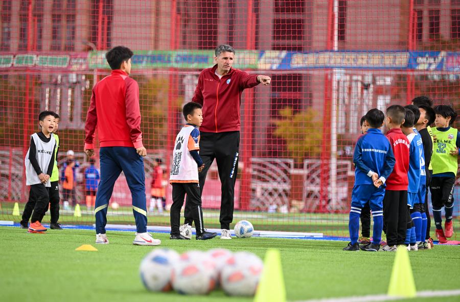 Serbian coach Aleksandar Pantic (3rd R) gives instructions to young football players during a training session at Tianjin Football Association Youth Training Center in north China's Tianjin Municipality, April 23, 2024.