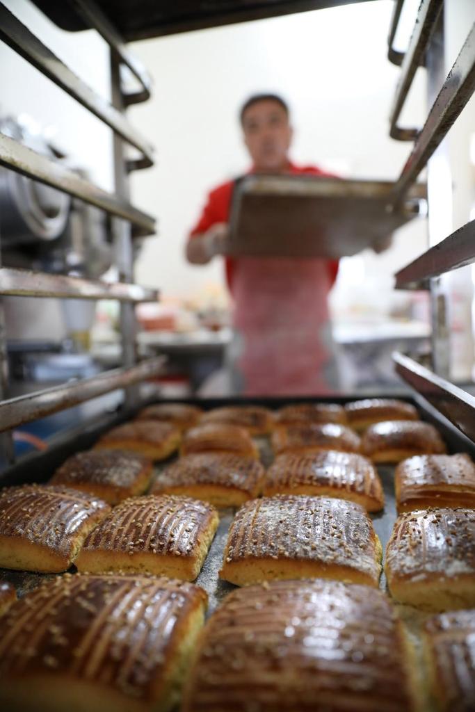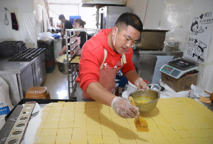 Wei Zhongshuai and his wife make biscuits at his bakery in Xiongyue Town, Bayuquan District of Yingkou City in northeast China's Liaoning Province, April 24, 2024.(Xinhua/Yao Jianfeng)
