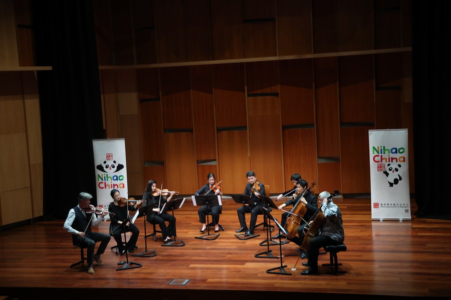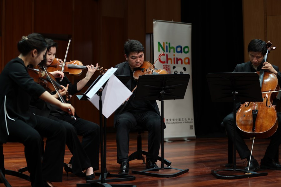 A joint performance by the Amber Quartet, one of China's most celebrated string quartets, and the artists from Christchurch are staged in Christchurch, New Zealand, April 26, 2024. (Photo by Meng Tao/Xinhua)