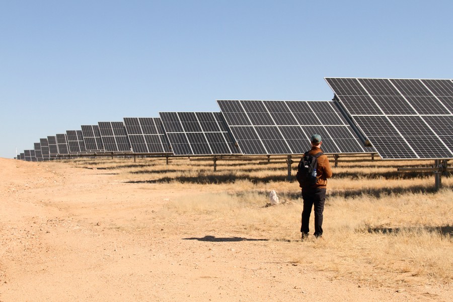 A person stands in front of photovoltaic panels at a photovoltaic (PV) power plant in Omaruru, the Erongo region, Namibia, on June 24, 2022. (Photo by Musa C Kaseke/Xinhua)