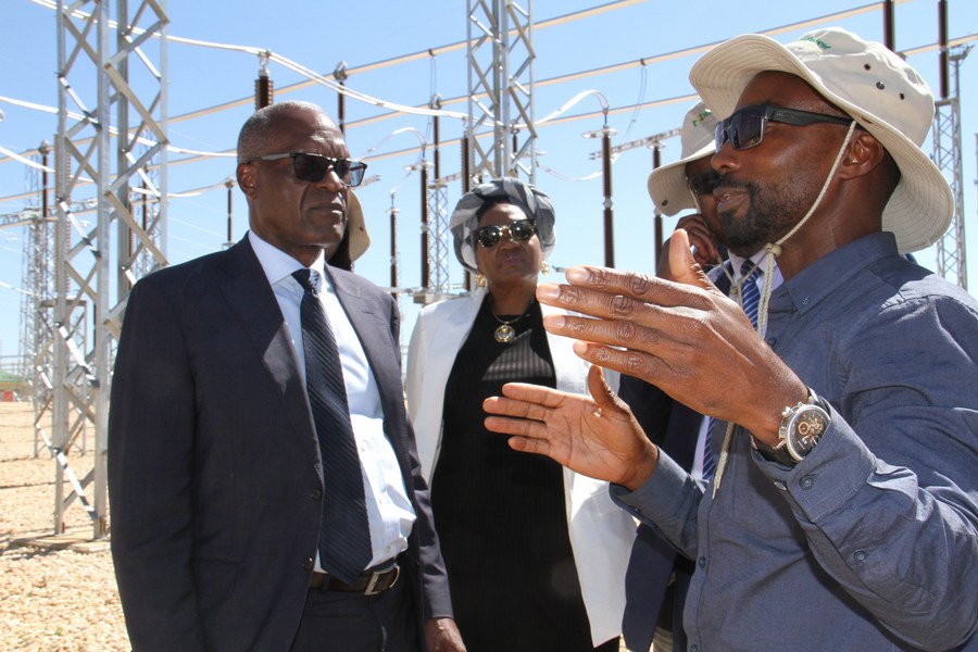 Namibian Minister of Mines and Energy Tom Alweendo (1st L) visits the Auas substation in Windhoek, Namibia, on April 26, 2024. (Photo by Musa C Kaseke/Xinhua)