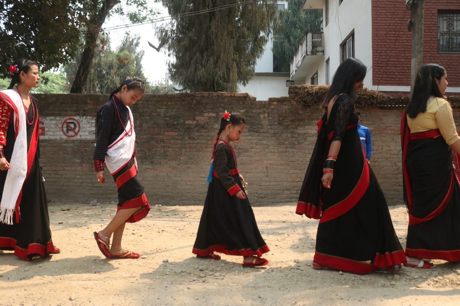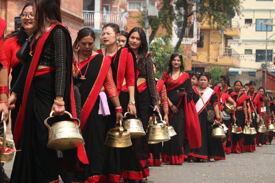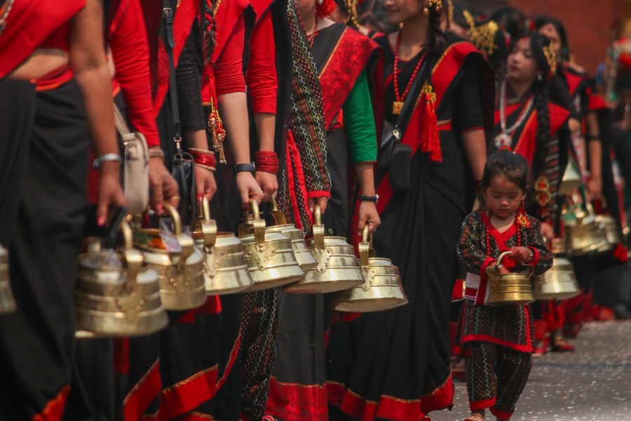 Nepali women and girls dressed in traditional attire carry offerings during celebrations of the Lava Jatra Festival at Hadigaun in Kathmandu, Nepal, April 26, 2024. (Photo by Sulav Shrestha/Xinhua)