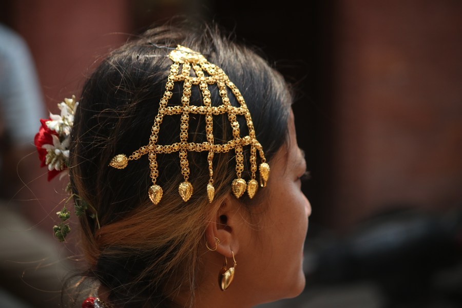A Nepali girl dressed in traditional attire is pictured during celebrations of the Lava Jatra Festival at Hadigaun in Kathmandu, Nepal, April 26, 2024. (Photo by Sulav Shrestha/Xinhua)